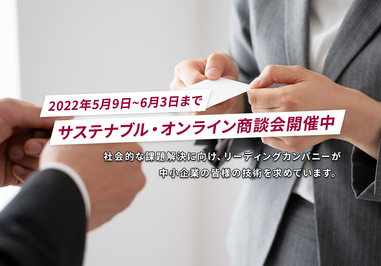 SDGs推進に挑むリーディングカンパニーの技術開発ニーズと、中小企業・小規模事業者の皆様の技術の出逢いを応援。社会課題の解決に向けた、新たなイノベーションの創造を後押しします。